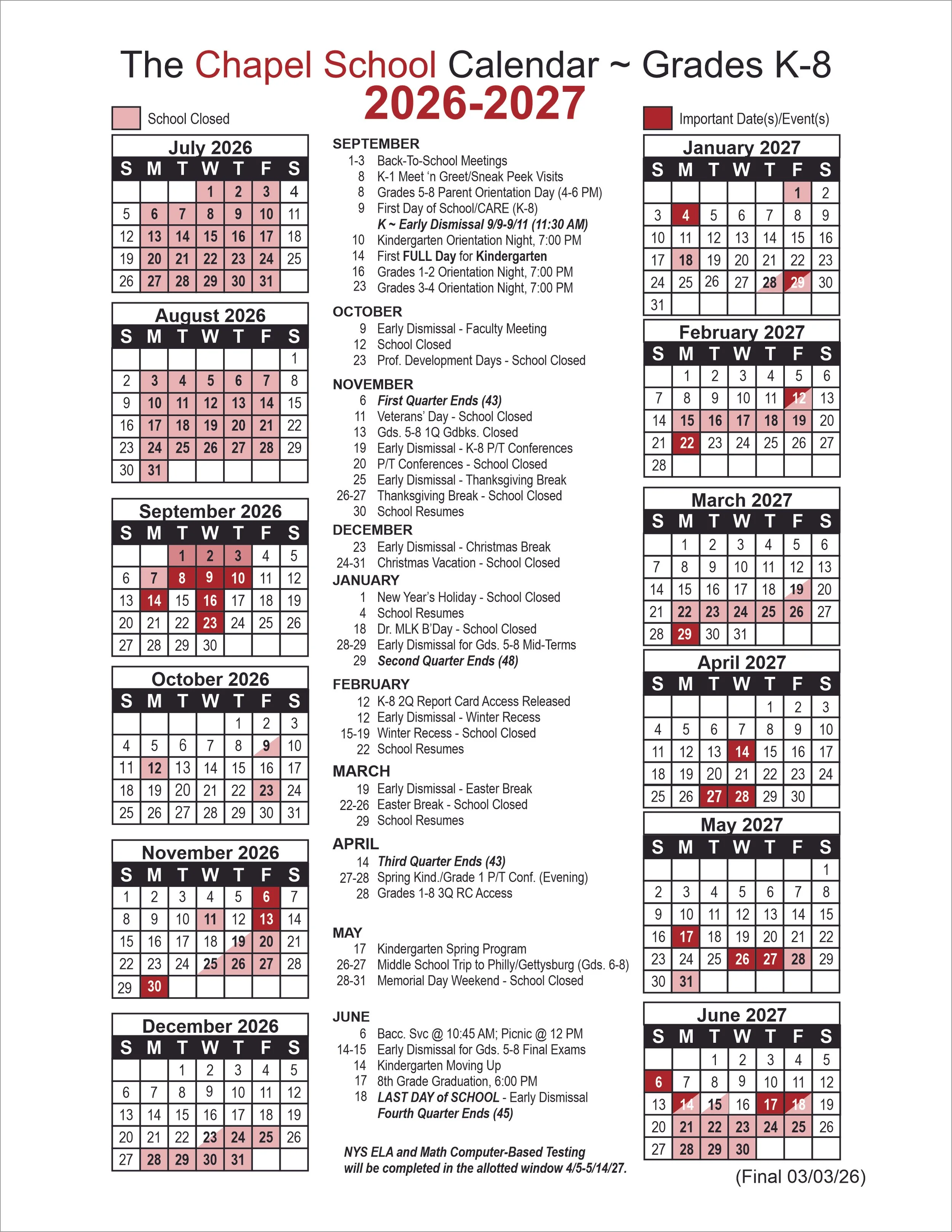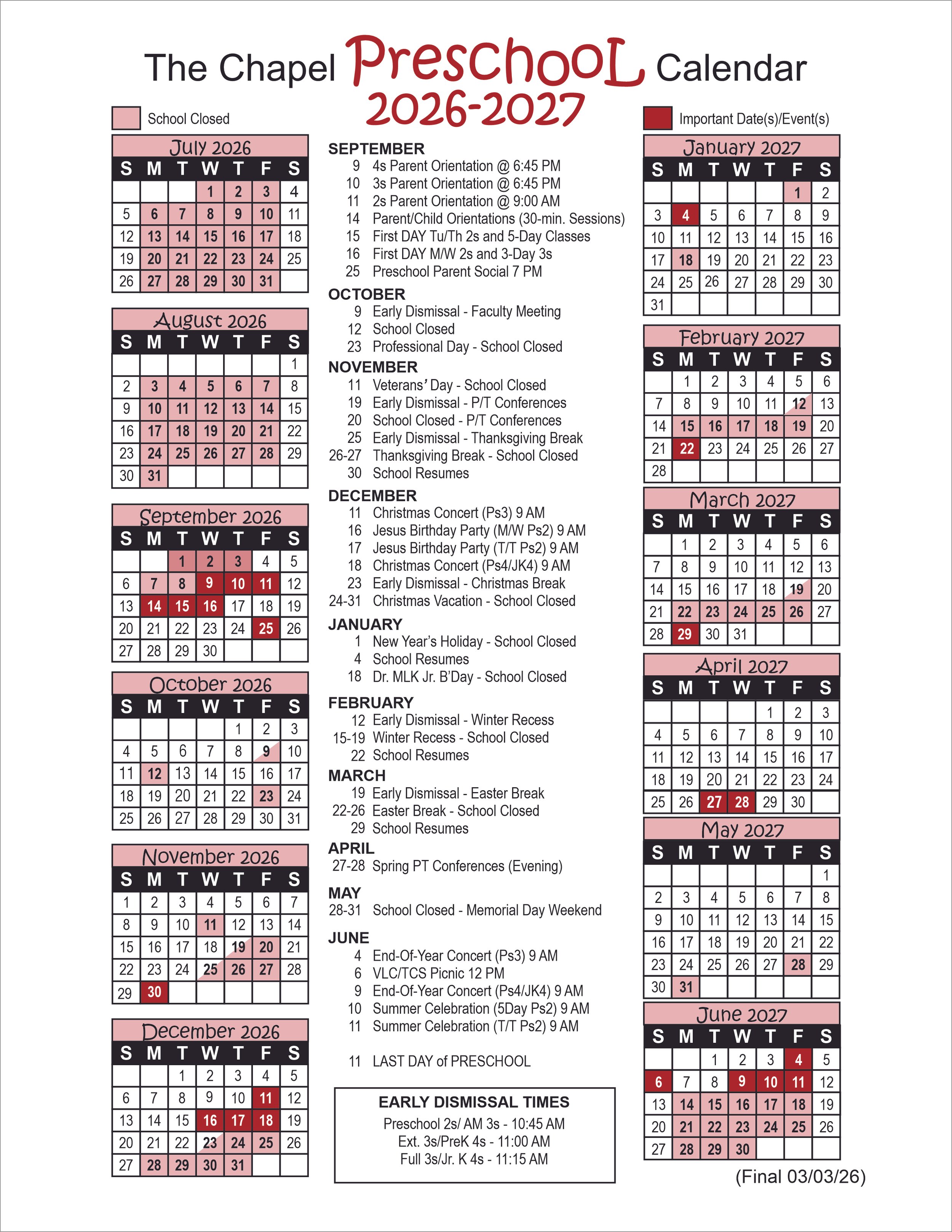 School Year CalendarsClick Buttons for Downloadable .PDFs. 2025-2026 PS CALENDAR 2026-2027 Preschool calendar 2025-2026 K-8 CALENDAR 2026-2027 K-8 Calendar